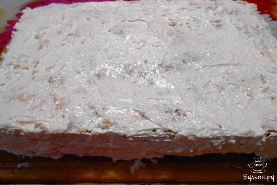 11. Надавливаем руками на последний корж, но не сильно, чтобы убрать лишние пузыри на слоеном тесте.