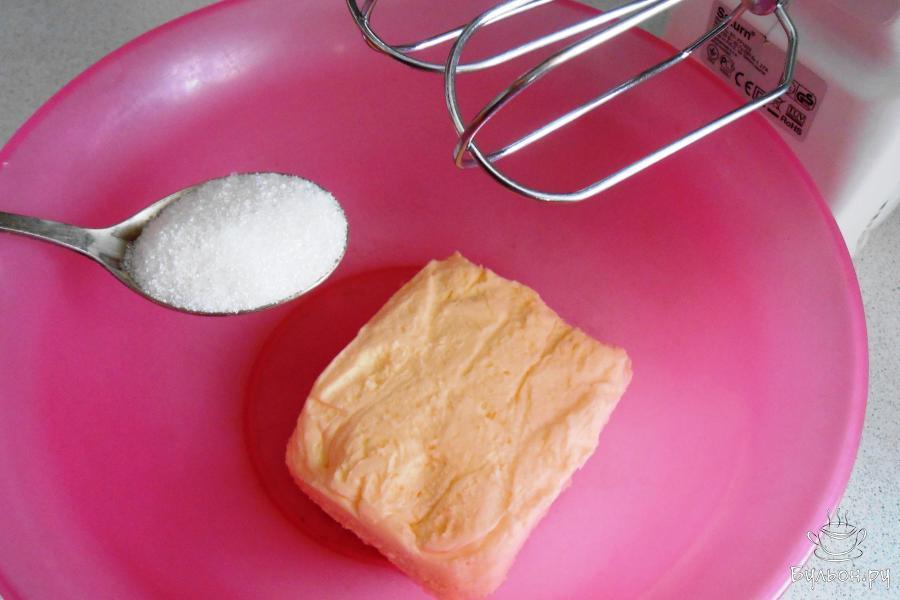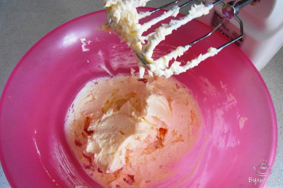 6. Тем временем делаем сливочный крем. Мягкое сливочное масло взбиваем с ванильным сахаром на средних оборотах миксера, добавляя по одной столовой ложке обычного сахара.