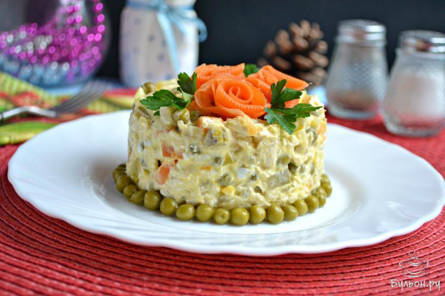7. Подать салат "Столичный" можно порционно, оформив его с помощью кольца кулинарного или выложить в красивый салатник. Я украсила салат розочками из моркови, горошком и зеленью. Приятного аппетита.