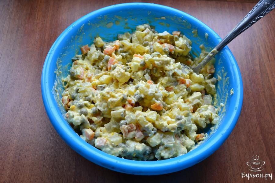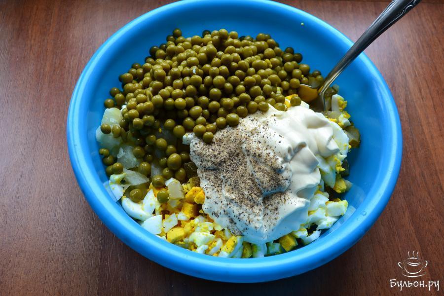 5. Все порезанные продукты соединить, добавить консервированный горошек, а также, майонез. Все поперчить.