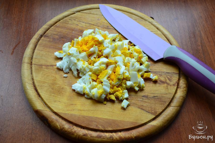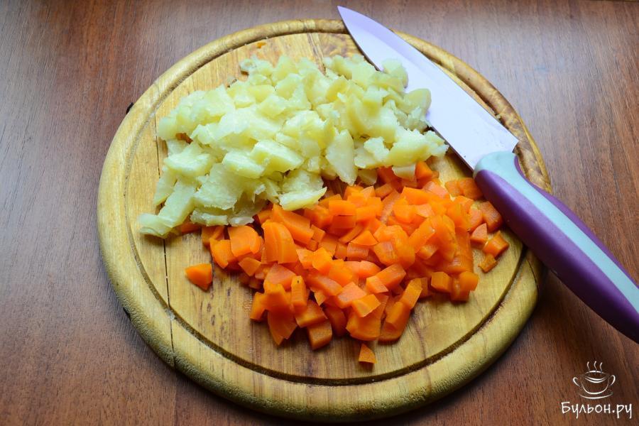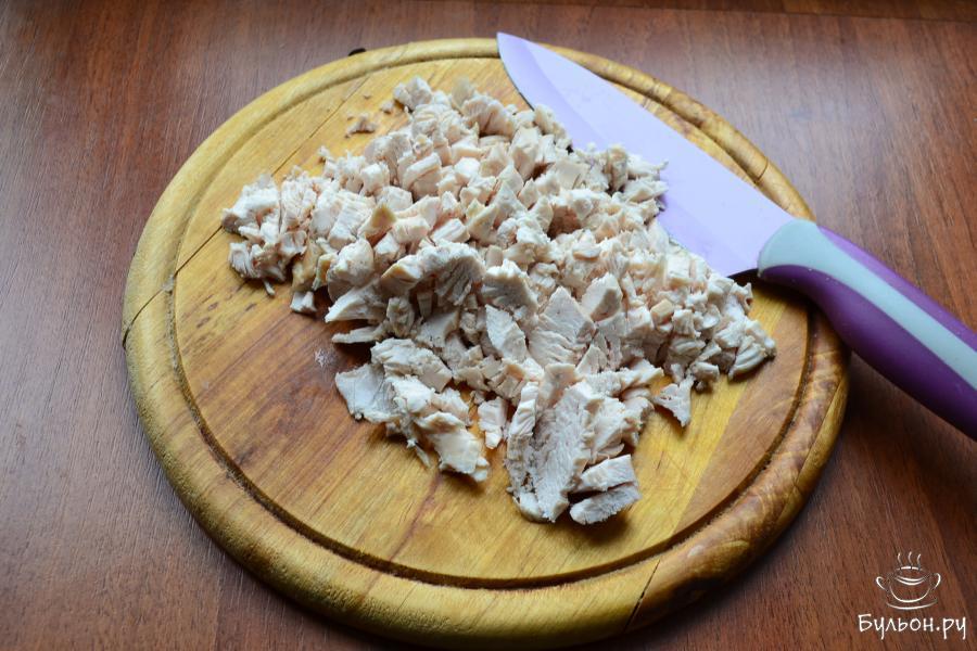 1. Куриное филе нужно отварить в воде, подсолив ее. Картофель, яйца и морковь также отварить. Филе должно полностью остыть, порезать его кусочками.