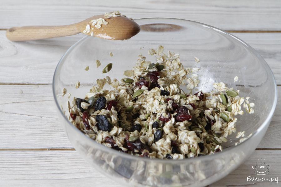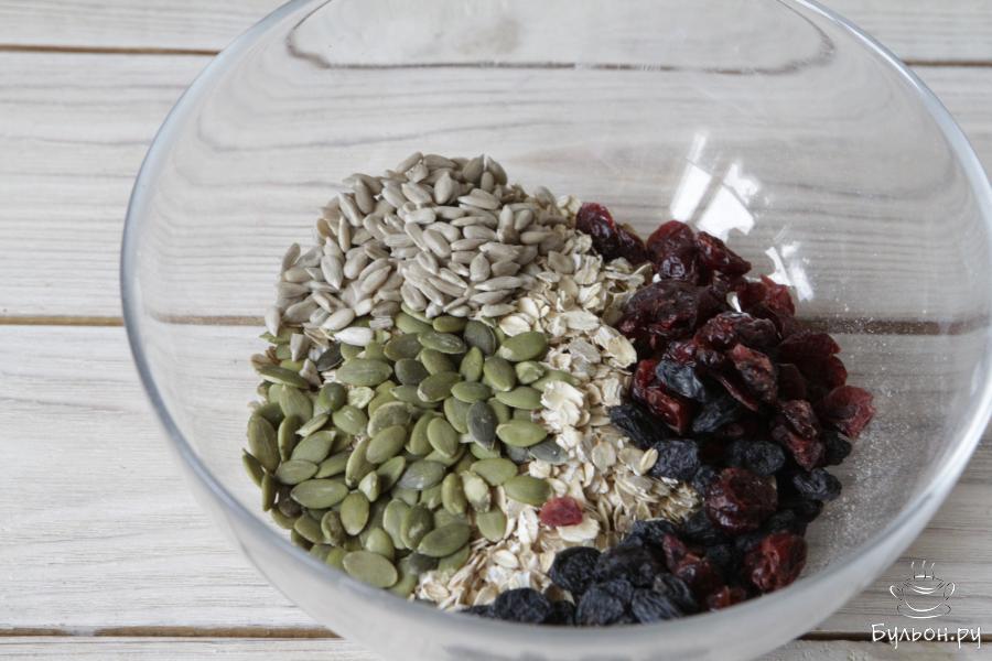 3. Приготовить следующие ингредиенты: овсяные хлопья, вяленую клюкву, изюм, семечки тыквы и семена подсолнечника.