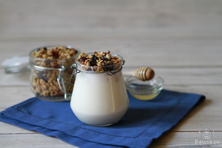 Гранола так плотно вошла в наш рацион, что большинство не покупают ее в магазине, а готовят самостоятельно. И в этом есть огромный плюс. Ведь можно добавить абсолютно любые ягоды, семечки, приготовить гранолу в меру сладкой или вовсе без сахара, с цукатами и без, оттенить ее вкус лимонным или апельсиновым ароматом. Безусловно многое зависит от ваших предпочтений и вкусов. И домашняя гранола, приготовленная на сковороде будет ничем не хуже готовой покупной смеси. Подавать ее можно самостоятельно в качестве сухого завтрака, заправлять йогуртом, молоком, обезжиренным творожком. Хранить готовую смесь лучше всего в контейнере и в холодильнике.