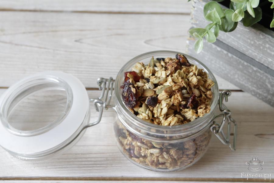 8. Гранола должна остыть. Затем разложить ее по банкам или контейнерам. Я храню гранолу в холодильнике.