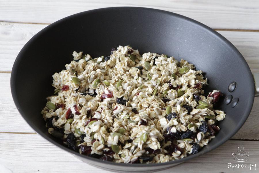 7. Сковороду разогреть и выложить на нее смесь. На среднем огне просушить гранолу регулярно помешивая. Как только хлопья приобретут коричнево-золотой оттенок, гранола готова.