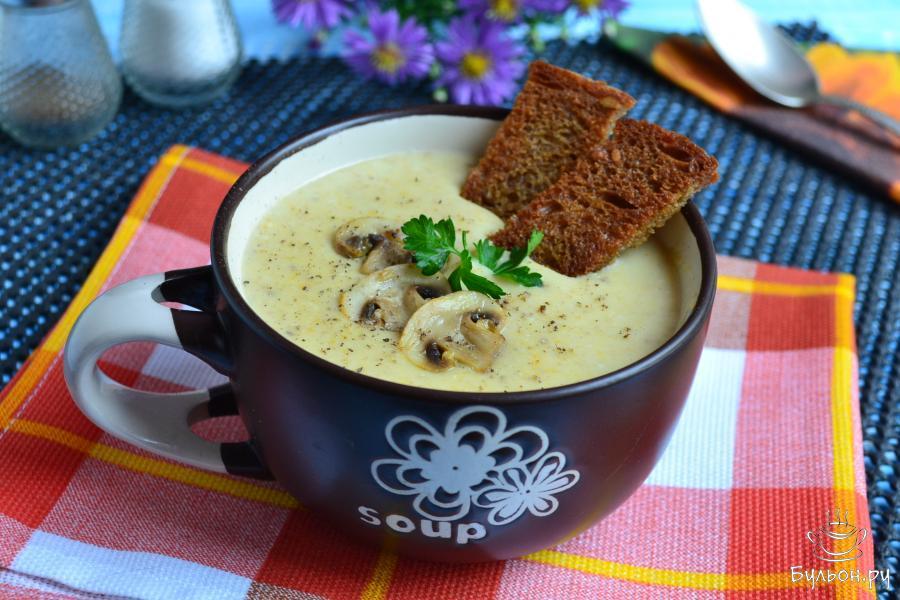 Суп-пюре - замечательное горячее блюдо, готовится которое из сваренных и перетертых различных овощей, курицы, бобовых, мяса, всевозможных круп и т. Д. Супы-пюре пользуются популярностью у многих и заслуженно. Эти супы легко усваиваются организмом, очень аппетитно выглядят, получаются вкусными и нежными. Хочу предложить вам попробовать грибной суп-пюре, в который добавлен плавленный сыр. Плавленный сырок нужно выбирать только высшего качества. Этот суп с ярко-выраженным вкусом понравится вам и вашим близким. Подать такой суп можно на обед с гренками собственного приготовления или сухариками.
