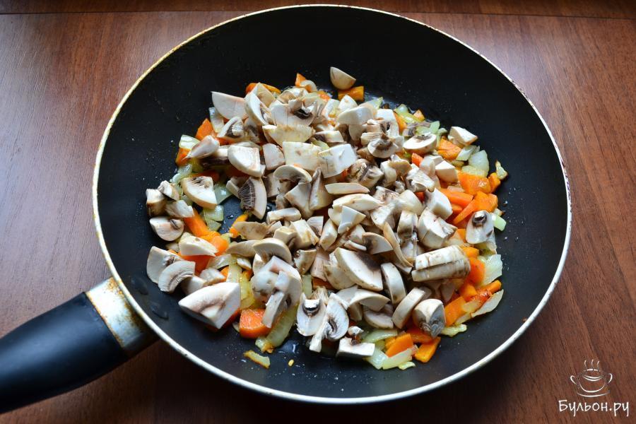 3. Обжаривать овощи до мягкости, после чего добавить к ним порезанные свежие грибы. Обжаривать все несколько минут.