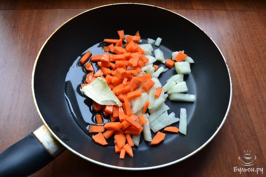 2. Лук с морковкой порезать не крупно, выложить в сковороду со сливочным, а также с растительным маслом.