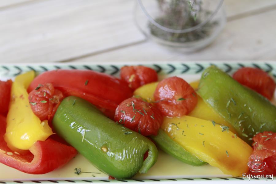 5. С помидор черри аккуратно снять кожуру, выложить на блюдо к болгарскому перцу и приправить второй веточкой тимьяна.