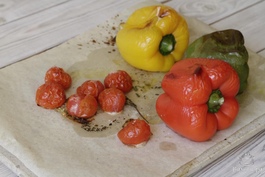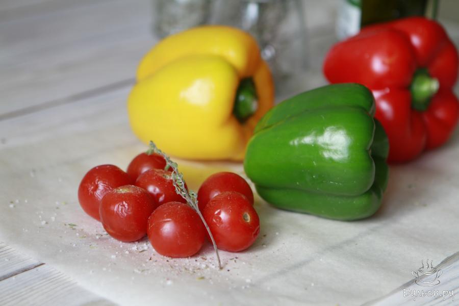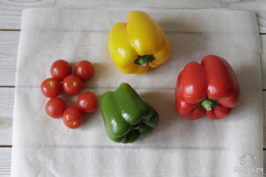 1. Подготовить овощи. Болгарский перец и помидоры черри промыть, обсушить и выложить на лист для запекания.