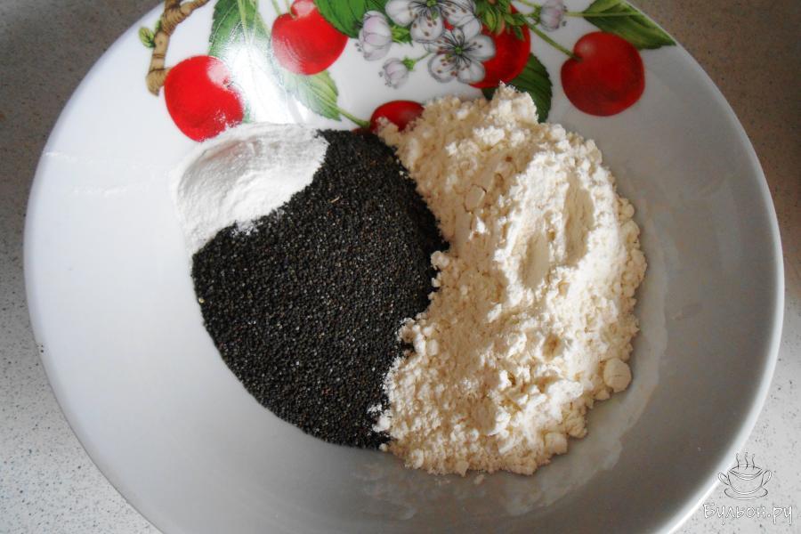 5. В чистой и сухой мисочке смешиваем мак, оставив немного для украшения по желанию, с мукой и разрыхлителем.