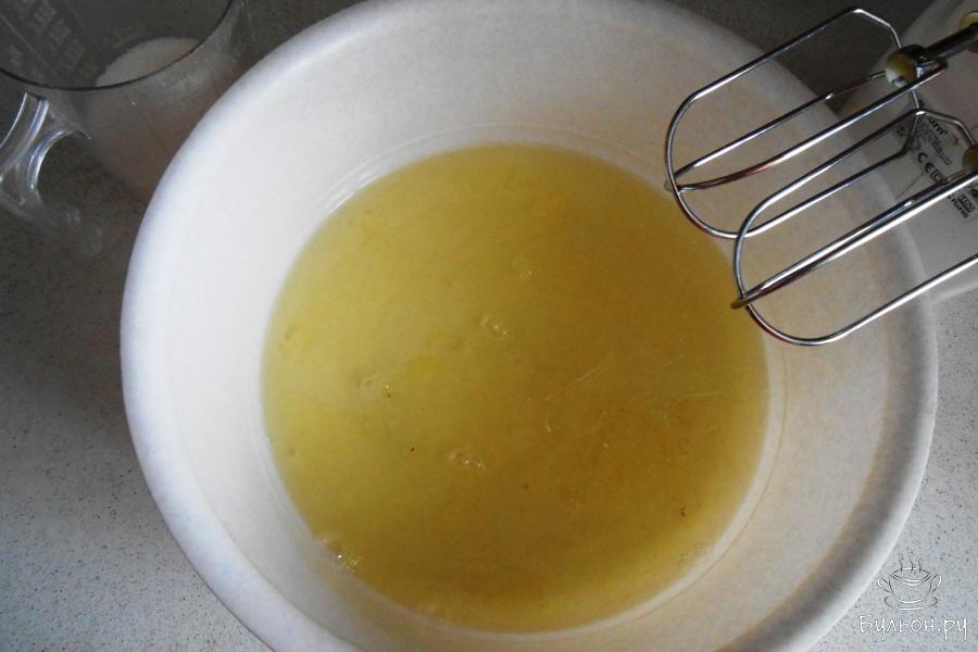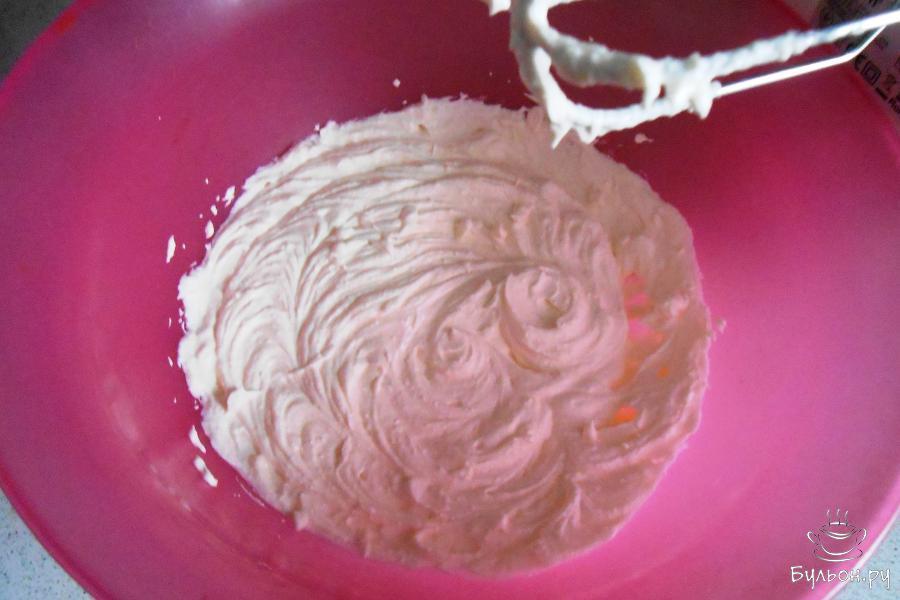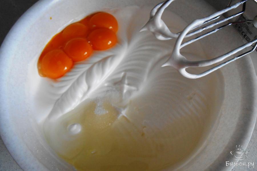 2. Восемь холодных белков взбиваем миксером на средних оборотах, понемногу добавляя 100 грамм сахара.