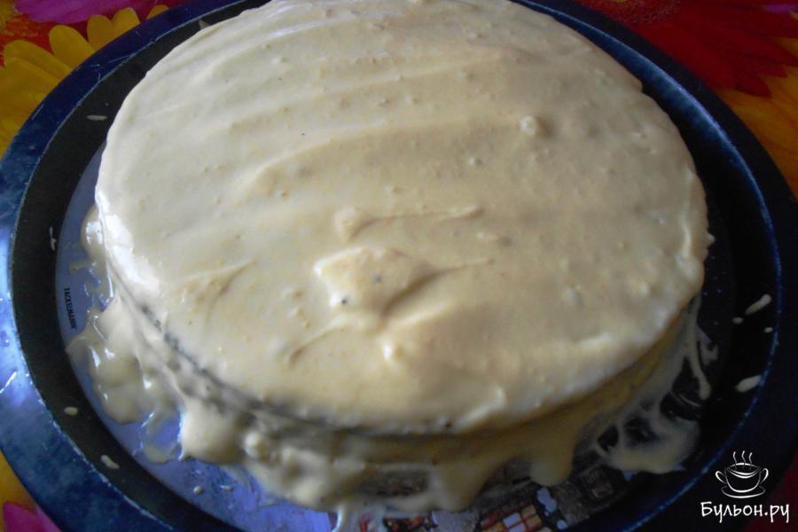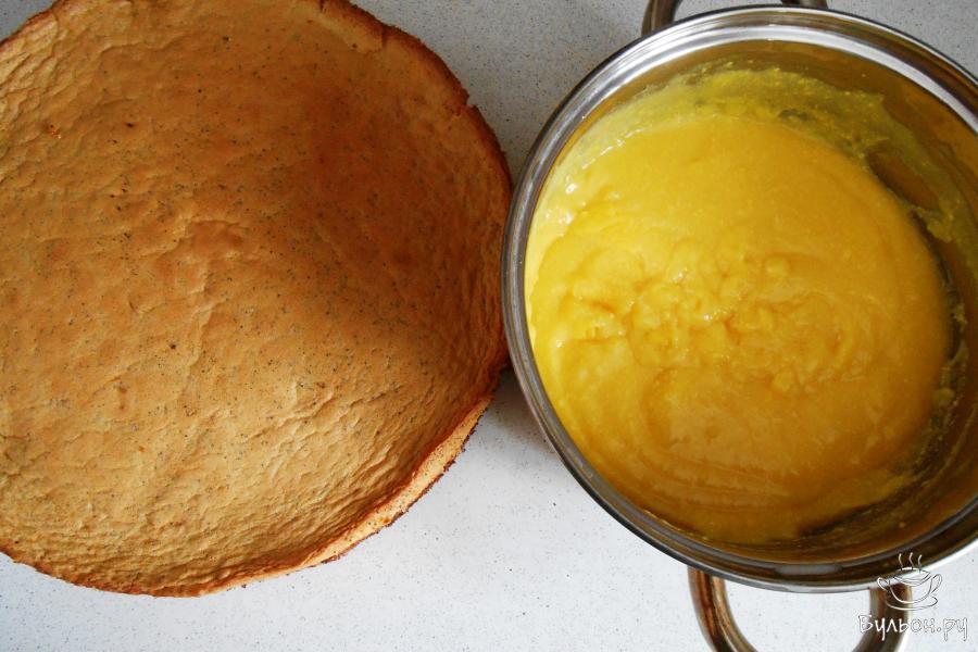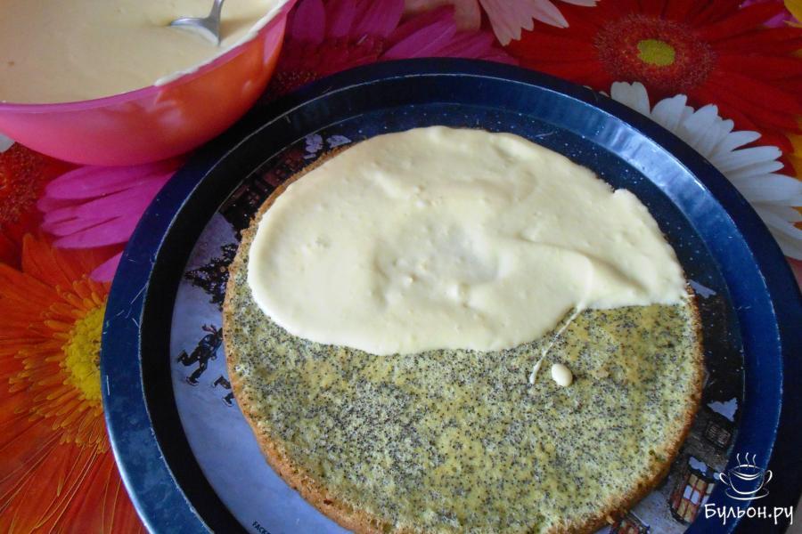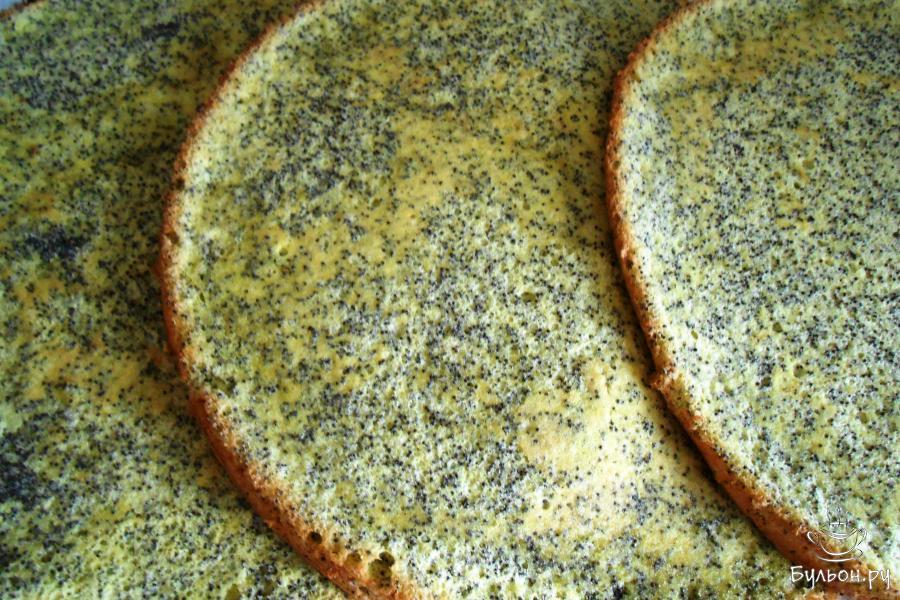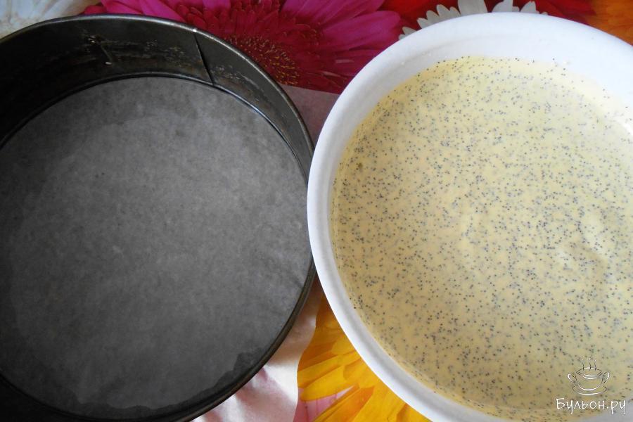 7. Получившееся тесто визуально разделяем на три части. В разъемную форму диаметром 26 см с пергаментом выливаем 1/3 часть макового теста и выпекаем 10 минут при температуре 175 градусов.