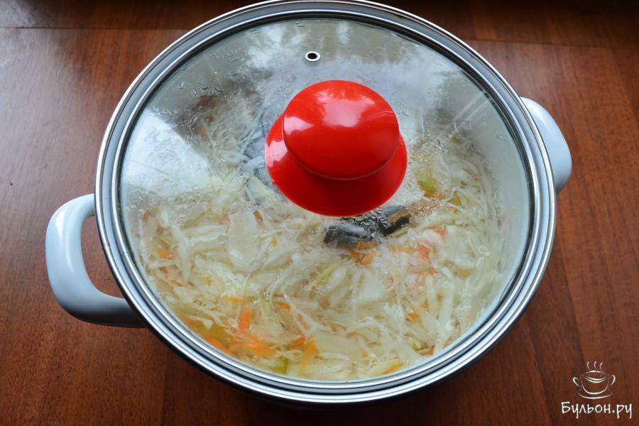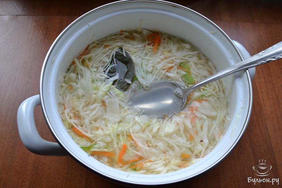 6. Также, добавить лавровый листочек. Накрыть емкость с капустой плотно крышкой, оставить до остывания - на два часа. Готовую, быстромаринованную капусту далее нужно отжать хорошенько от маринада, поместить ее в банку и отправить в холодное место.