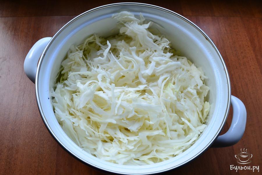 1. Капусту, желательно не зеленую, тонко нашинковать вручную или на специальной терке, поместить ее в глубокую емкость, например, кастрюлю.