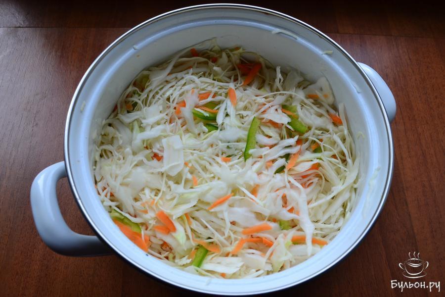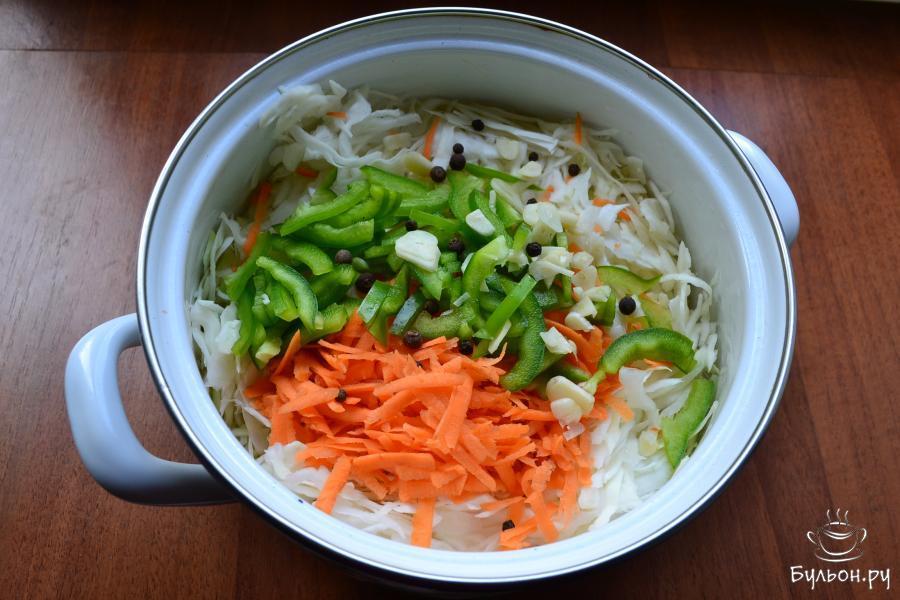 2. Добавить к капусте очищенную морковку, тертую на самой крупной терке. Также, можно использовать терку для приготовления корейской моркови. Добавить мясистый перец болгарский красного или зеленого цвета, порезанный соломкой или длинными кусочками.