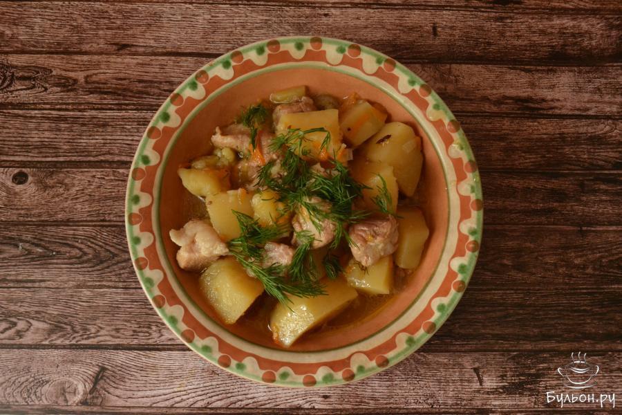 Чтобы накормить большую семью, нужно блюдо сытное, а чтобы сделать это быстро, то готовиться оно должно просто. Таким блюдом, на мой взгляд, является тушеная картошка. Готовить ее мы будем с мясом: сегодня выберем свинину а вообще, подойдет и другое мясо. Говядина будет тушиться дольше, курица будет готова довольно быстро. Картошка, тушеная вместе с мясом, будет гораздо вкуснее. Таким образом, в одном блюде мы сразу будем иметь и мясо, и гарнир, и соус.