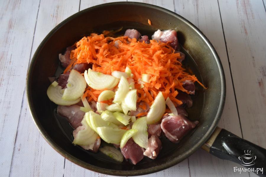 3. Затем добавим к мясу нашинкованные лук и морковь. Обжарим все вместе, пока не подрумянятся овощи.