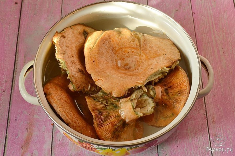 2. Промывать рыжики нужно тщательно, особенно если собраны они в еловом лесу, иногда на них бывает много налипших иголок. А промытые грибы отварить 25 минут от начала закипания воды. Воду подсолить.