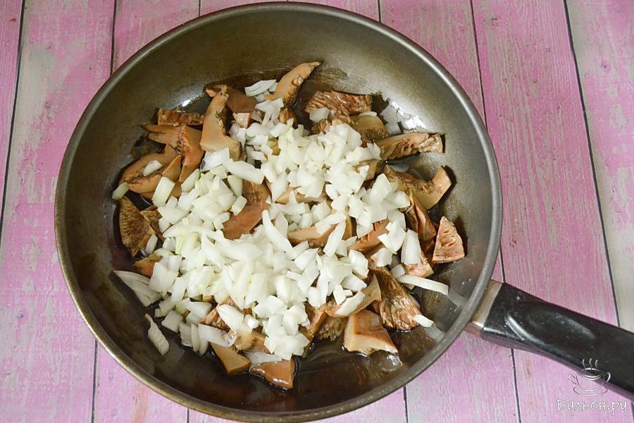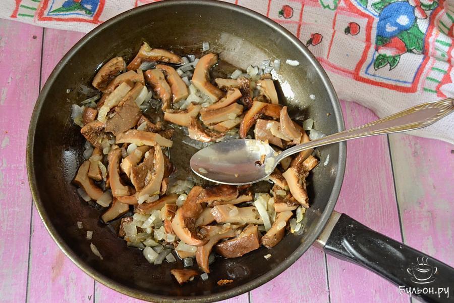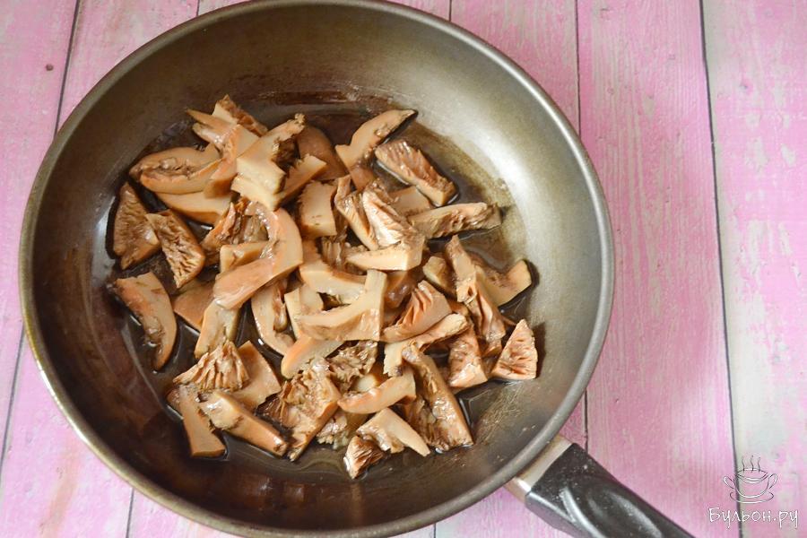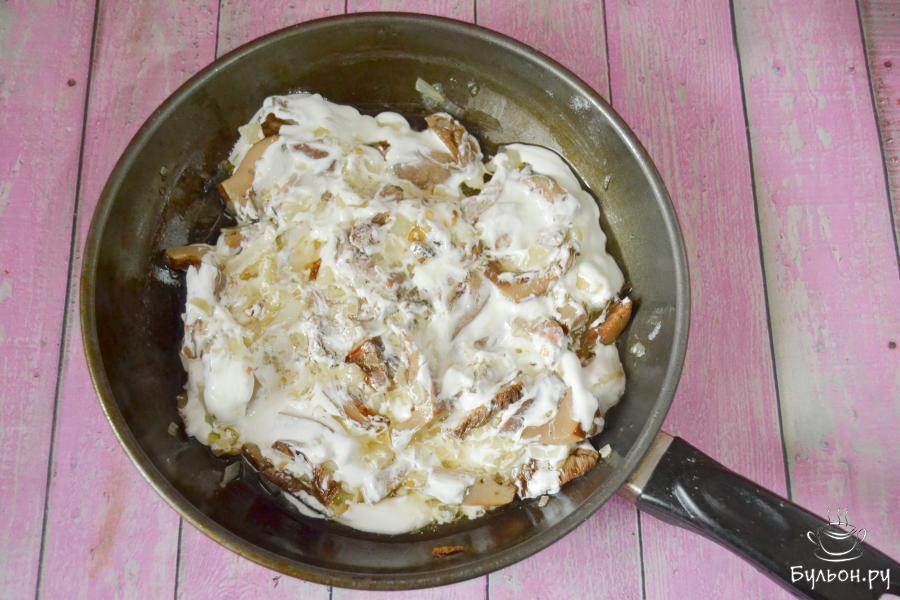 9. В поджаренные рыжики добавить сметану, перемешать и прожарить пару минут. При необходимости посолить и поперчить.