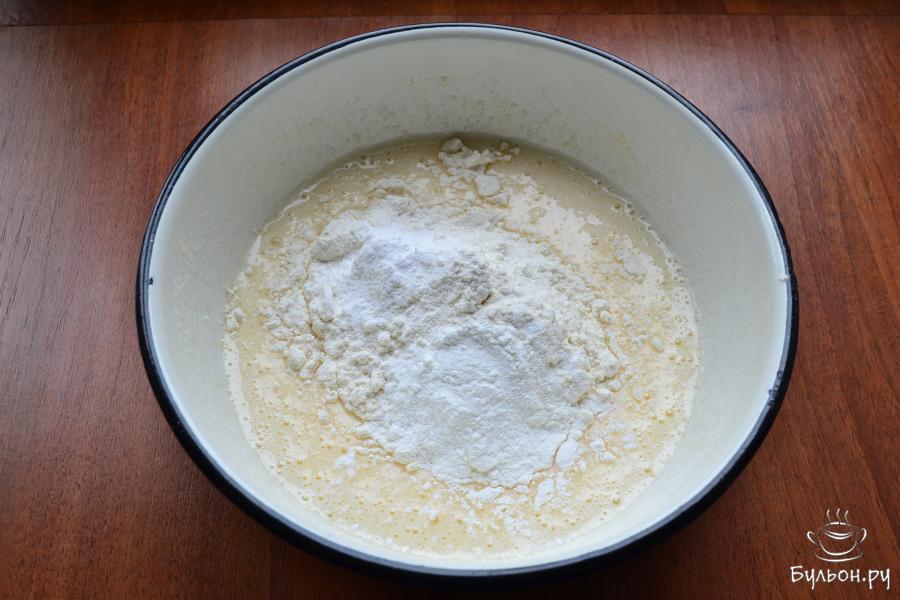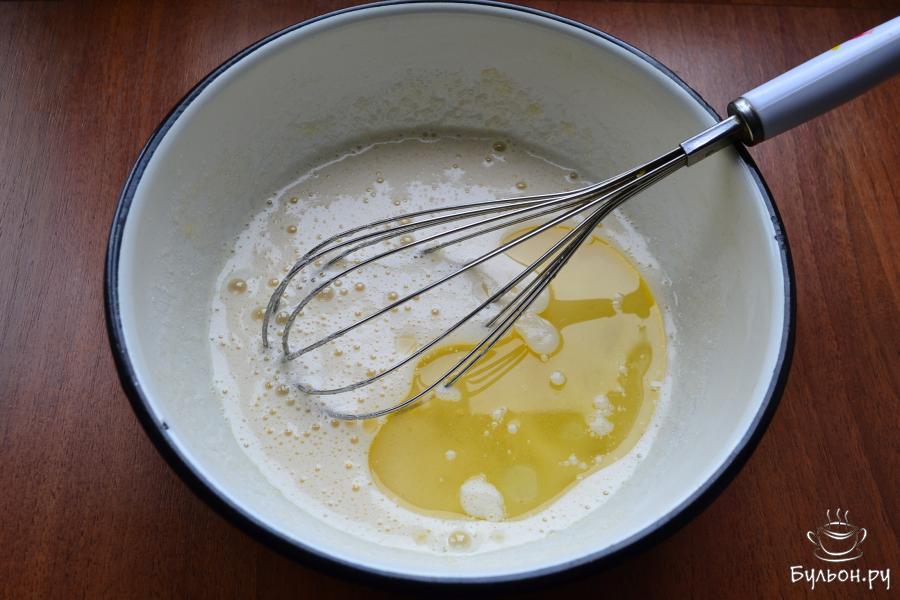 2. Взбить венчиком все до светлой массы, влить масло растительное, добавить сахар ванильный, перемешать.