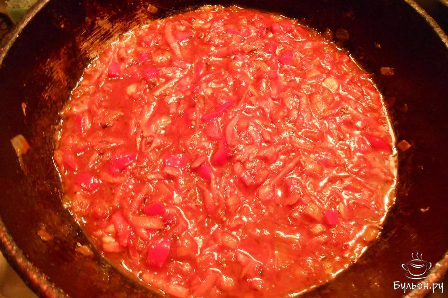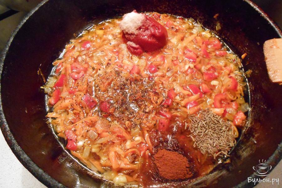 12. Добавить в сковороду томатную пасту, молотую паприку, тмин, соль, перец и 100 мл воды. Перемешать.