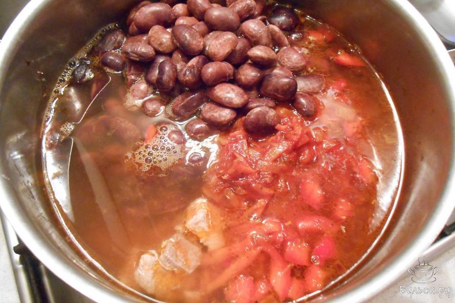 15. Овощную заправку и фасоль выложить к мясу. Довести до кипения и варить на медленном огне при закрытой крышке 20 минут, помешивая, чтобы не пригорело.