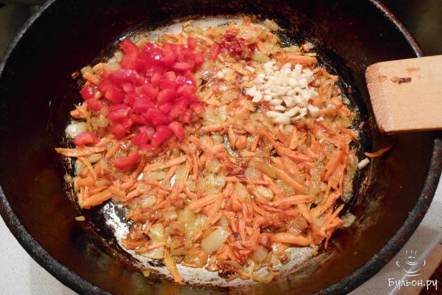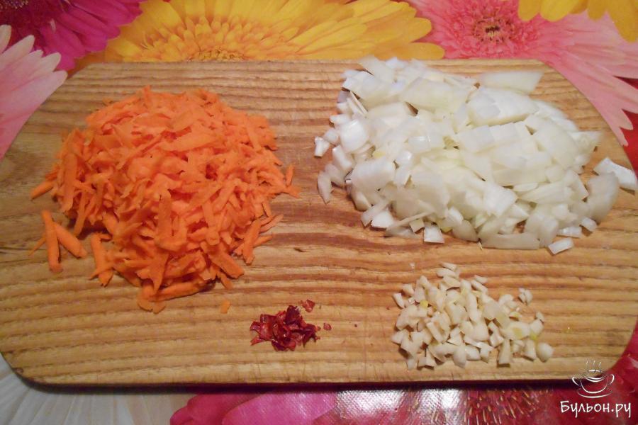 8. Нарезать лук и болгарский перец кубиками. Морковь натереть на крупной терке. Мелко нарезать перец чили и чеснок.
