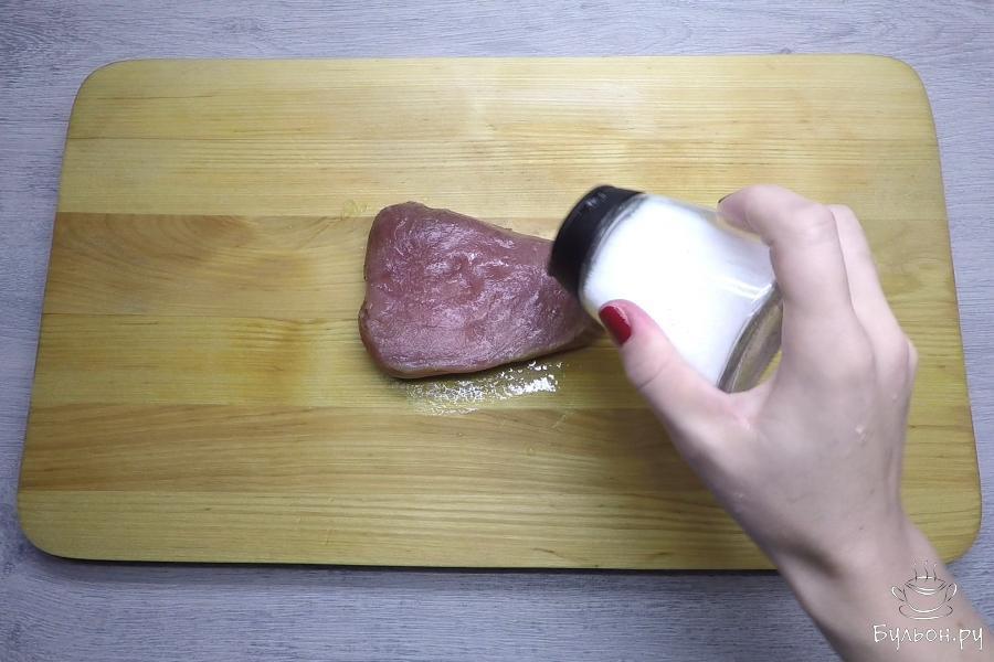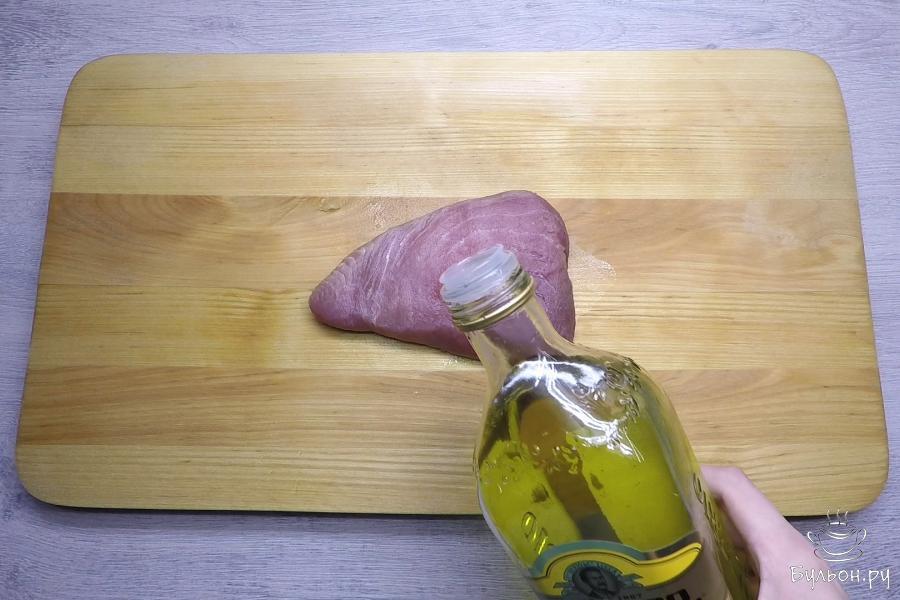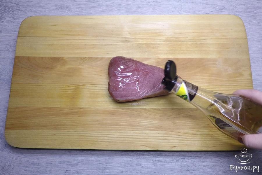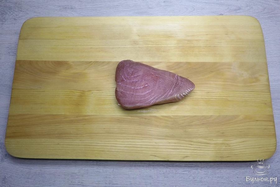 1. Филе охлажденного тунца промыть под холодной проточной водой. Обсушить тканевым или бумажным полотенцем.