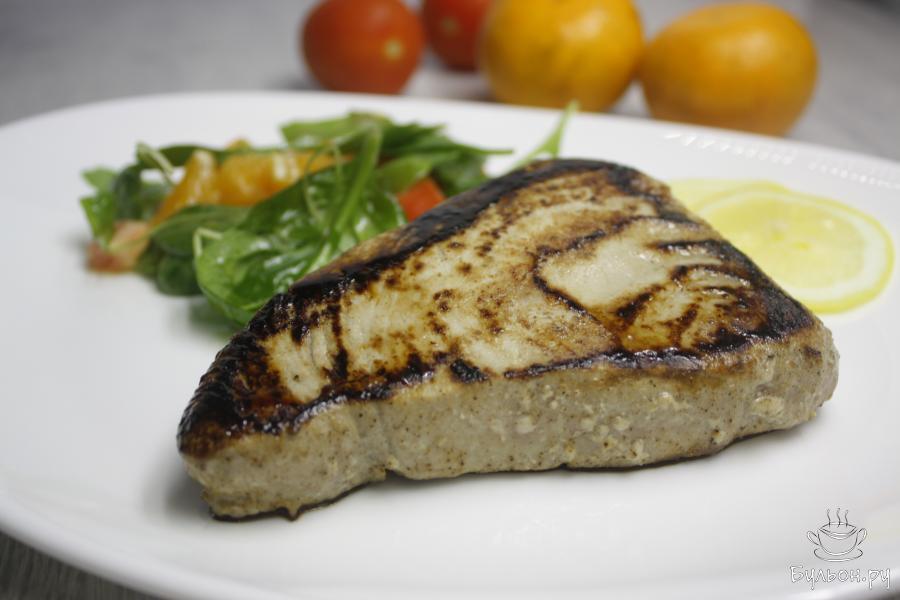 Стейк из филе тунца - вкусное полезное блюдо. Мясо тунца богато белком и при этом нежирное, поэтому востребовано среди любителей "суперфуда" - очень полезной еды и правильного питания. Тунец отличается от других пород рыб - его мясо на вкус и по плотности больше похоже на говядину, но все же нежное как у любой рыбы. Поэтому чтобы приготовить филе тунца на сковороде нужно предварительно его обмазать маринадом из сока лимона и бальзамического уксуса, а затем быстро обжарить на раскаленной сковороде без масла. Как и хороший кусок говядины, тунца можно употреблять в пищу почти в сыром виде. Но не всем это по вкусу, поэтому сегодня предлагаю приготовить стейк из филе тунца средней прожарки.