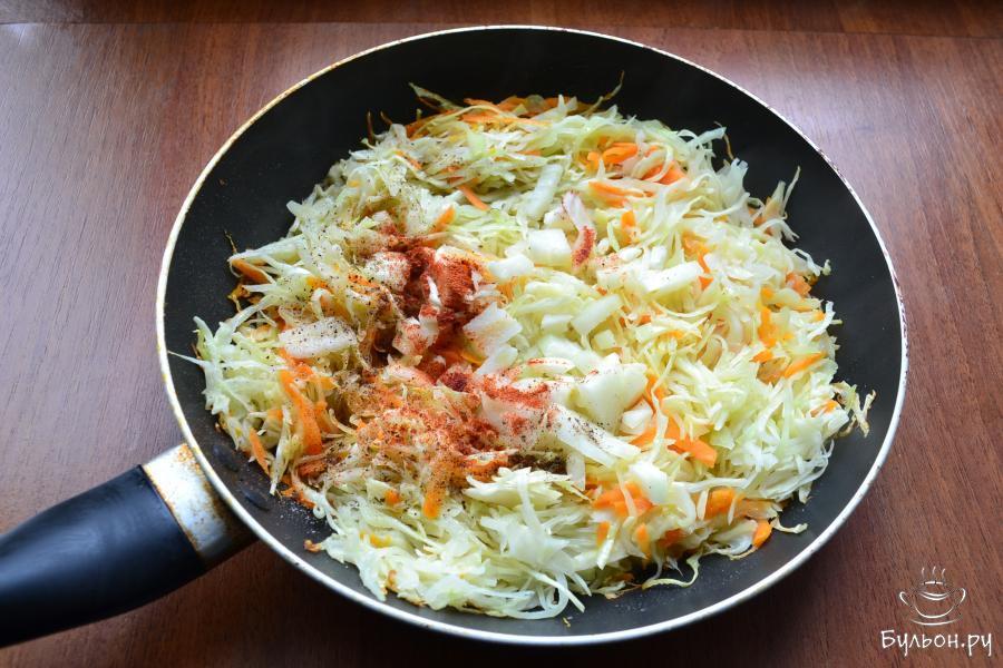 2. Капусту перемешать, добавить мускатный орех, перец, паприку и порезанный лук. Обжарить капусту немного, влить теплой воды и протушить ее минут 10. Капусте дать остыть.
