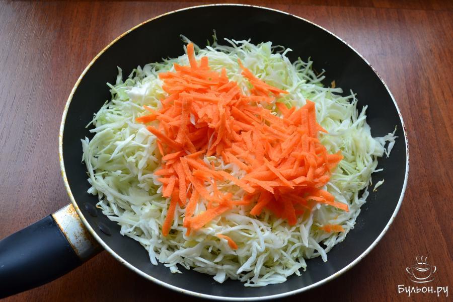 1. Капусту белокочанную нашинковать тоненько, добавить 0,5 ч. Л. Соли и помять, выложить в сковороду с растительным маслом. Добавить морковку, натертую на терке.