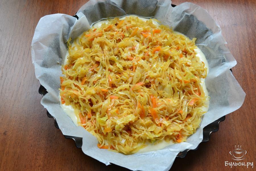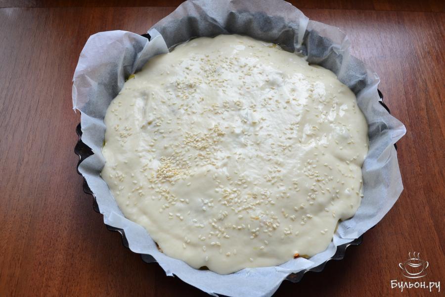 9. На капусту распределить оставшееся тесто так, чтобы оно ее покрыло полностью. Сверху пирог посыпать кунжутом.