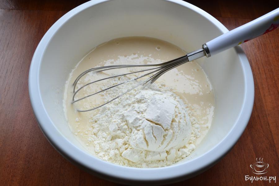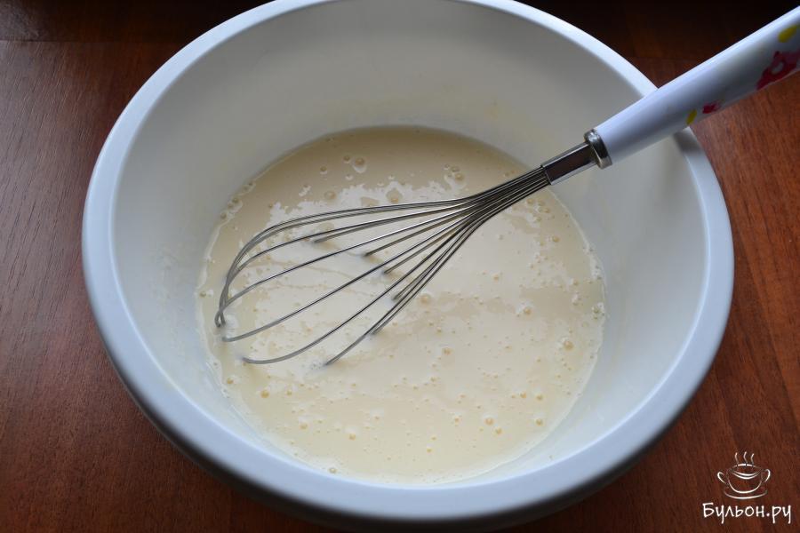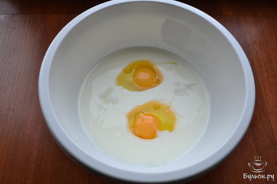 3. Кефир с любой жирностью вылить в миску, добавить сырые яйца, чайную ложку соли и пищевую соду. Все венчиком перемешать и оставить на 15-20 мин.