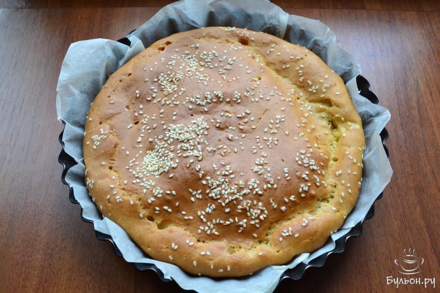 10. Печь пирог при 180 гр около сорока минут. Пирог должен хорошенько зарумяниться. Дать пирогу остыть минут 15 в форме, затем вынуть и порезать на части. Приятного аппетита.