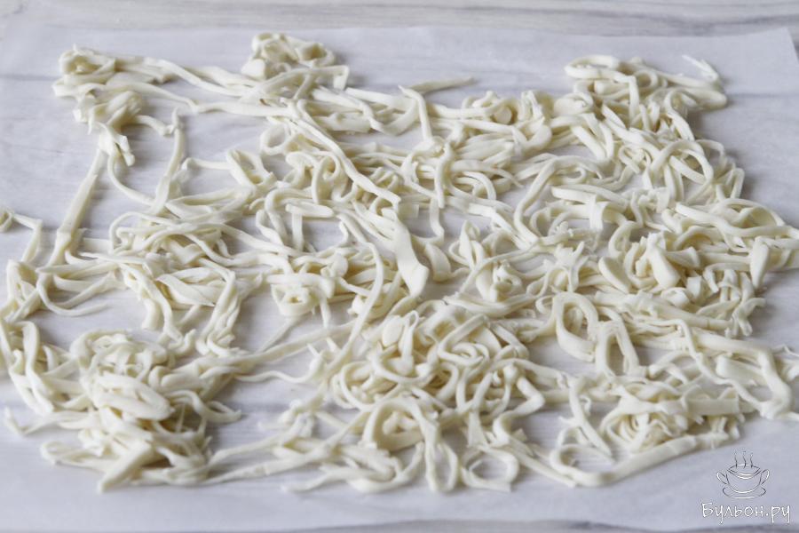 5. Для удобства разделить тесто на две части и раскатать каждую часть как можно тоньше. Оставить на столе, чтобы слегка подсохло.