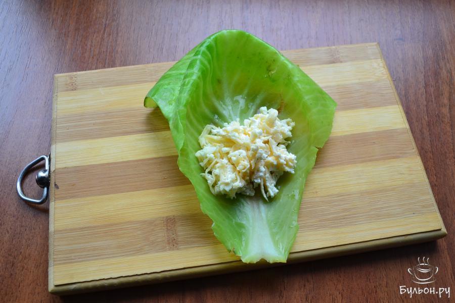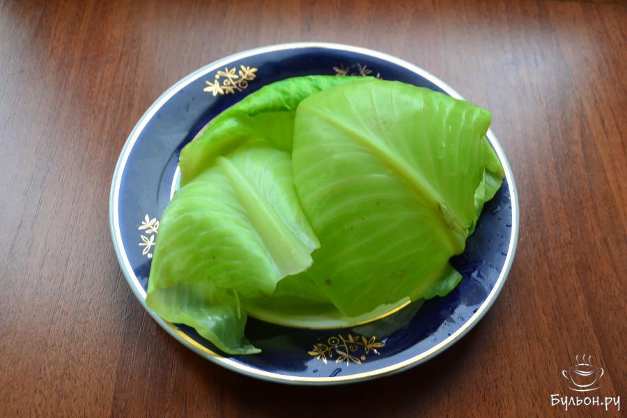 1. Капусту небольшую отварить в подсоленной воде, снимая постепенно с нее листья, подрезая утолщения ножом. Получится 7-10 листьев.