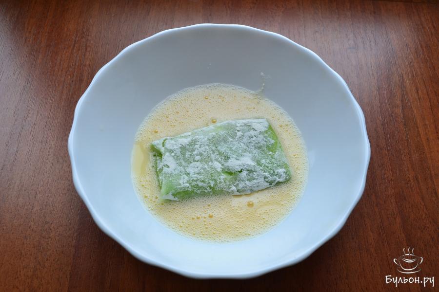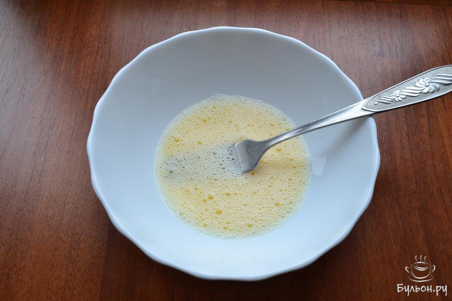 6. Приготовить льезон: яйцо интенсивно расколотить вилкой с водой и щепоткой соли. В отдельные тарелки всыпать пшеничную муку и панировочные сухари.