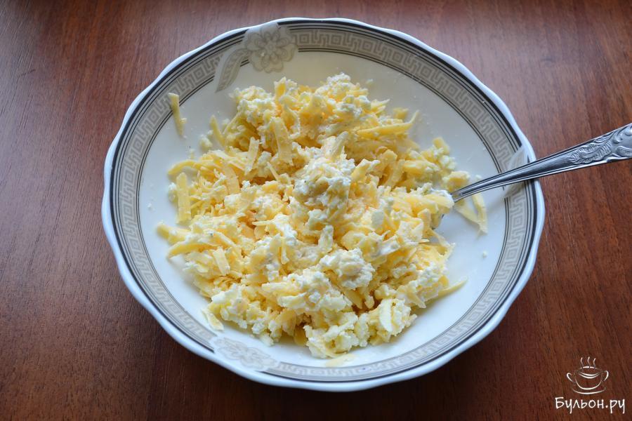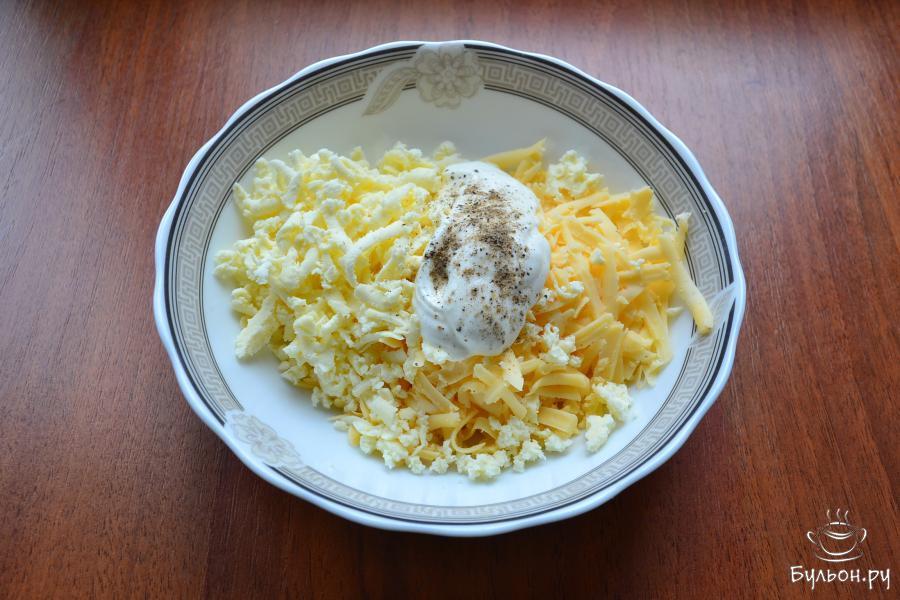 2. Сыр твердый и брынзу натереть на терке - можно средней, можно на крупной. Добавить ложку сметаны, перец и если нужно - посолить немного.