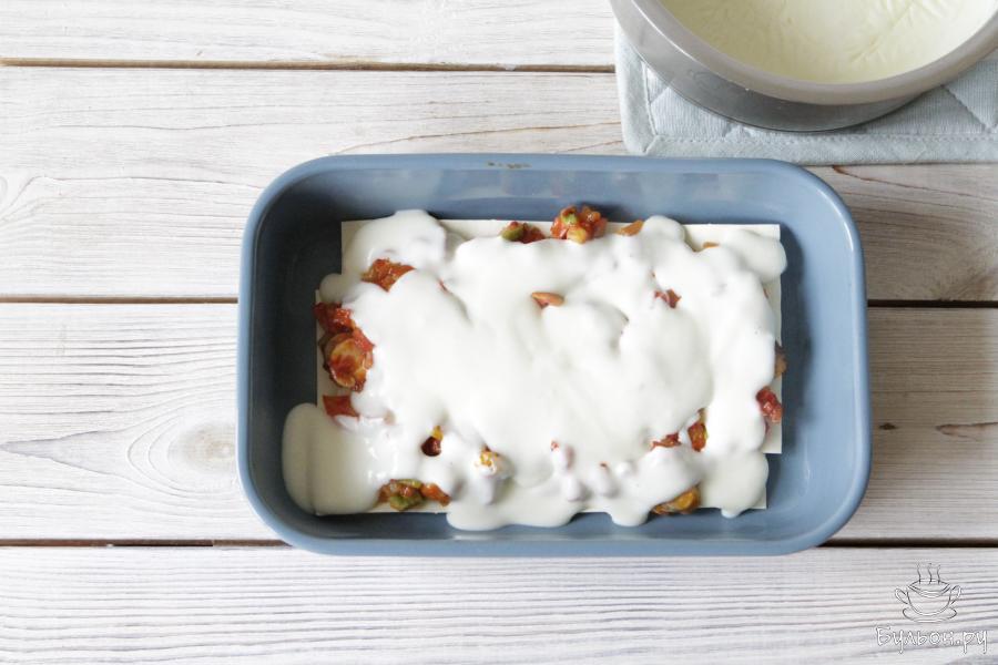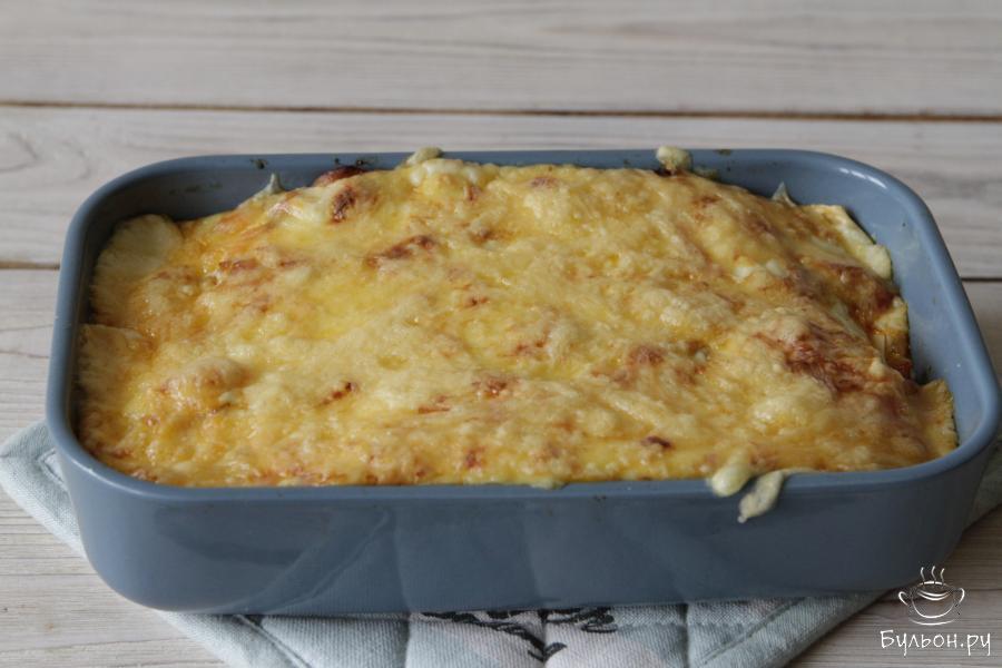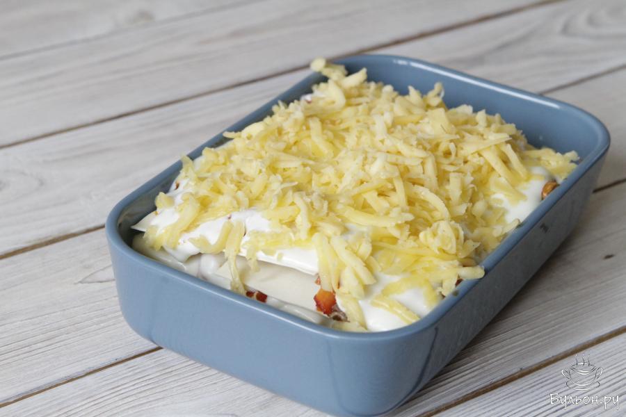 9. В такой последовательности собираем лазанью, пока не закончатся все ингредиенты. Сверху обильно присыпать тертым сыром.