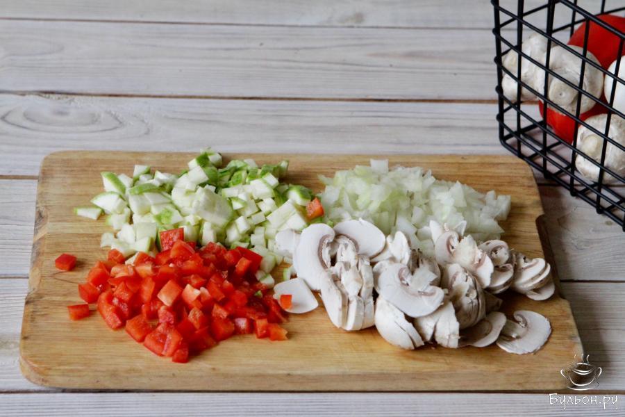 1. Подготовить овощи: кабачок, болгарский перец, репчатый лук, шампиньоны почистить, помыть и нарезать на небольшие квадратики или слайсы.