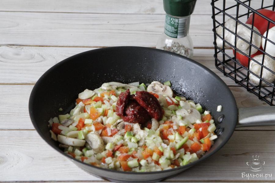 2. На растительном масле слегка обжарить все овощи одновременно. Добавить томатную пасту, посолить, поперчить и приправить травами по вкусу.