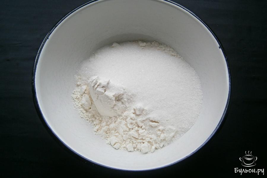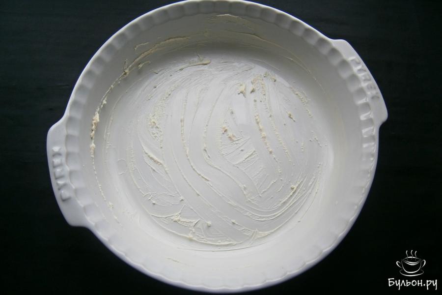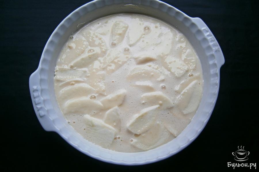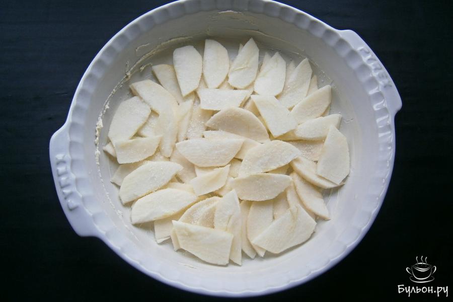 5. Яблоки очистить от сердцевины и кожуры, порезать их тонкими дольками. Выложить дольки на дно формы в 2-3 слоя. Посыпать яблоки 10 г сахара.