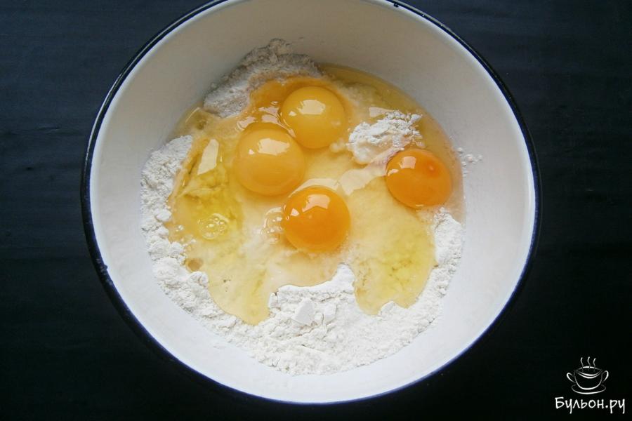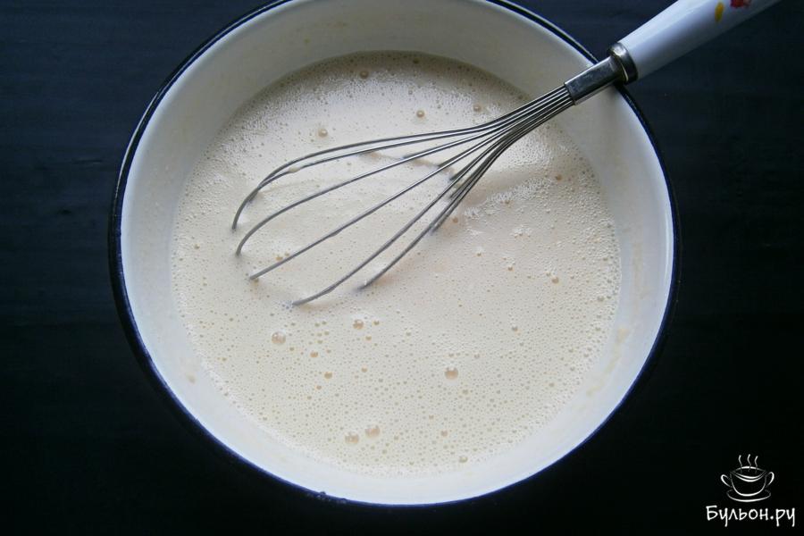 3. Влить коровье молоко и венчиком замесить жидкое однородное тесто, похожее на блинное. Хорошо его взбить.