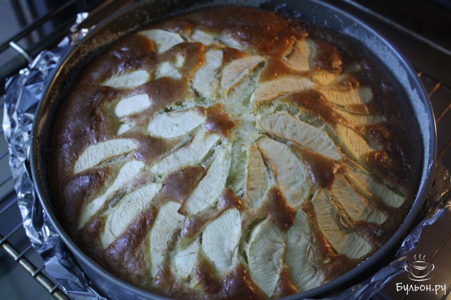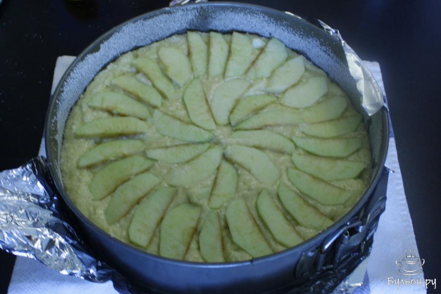 8. Творожное тесто с яблоками вылить в подготовленную форму для выпечки. Сверху выложить ломтики яблок, слегка вдавить.