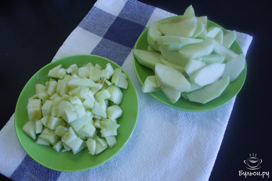 7. Половину яблок порезать кубиками и вместе с корицей добавить в тесто. Вторую половину порезать тонкими ломтиками и оставить для украшения.