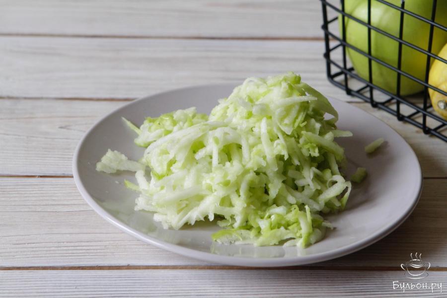 2. Яблоко помыть, высушить и не снимая кожуры натереть на терке. Чтобы яблоко не потемнело сбрызнуть его лимонным соком.