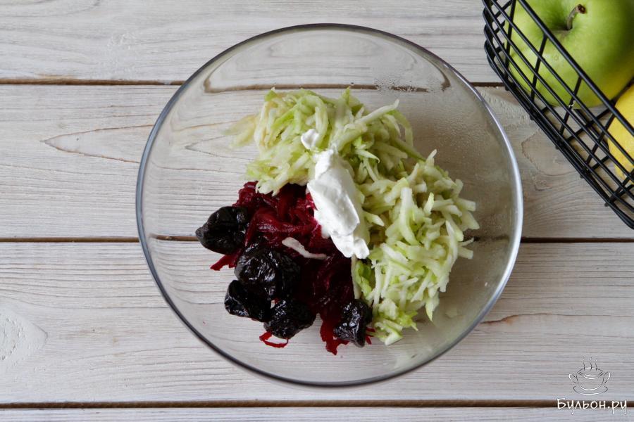 4. Все ингредиенты переложить в чашу. Если ягоды чернослива крупные, то можно их порезать. Добавить сметану и все ингредиенты хорошо перемешать между собой.