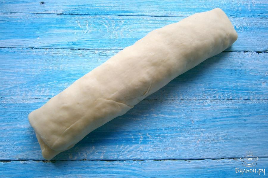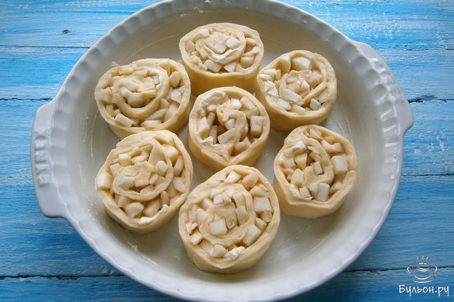 10. Разрезать рулет на семь одинаковых частей и разместить их в смазанной немного любым жиром форме д. 25 см. Прикрыть форму с пирогом пленкой, дать ему немного подойти. Отправить пирог в горячую духовку. Выпекать 35-40 минут при 180 гр.