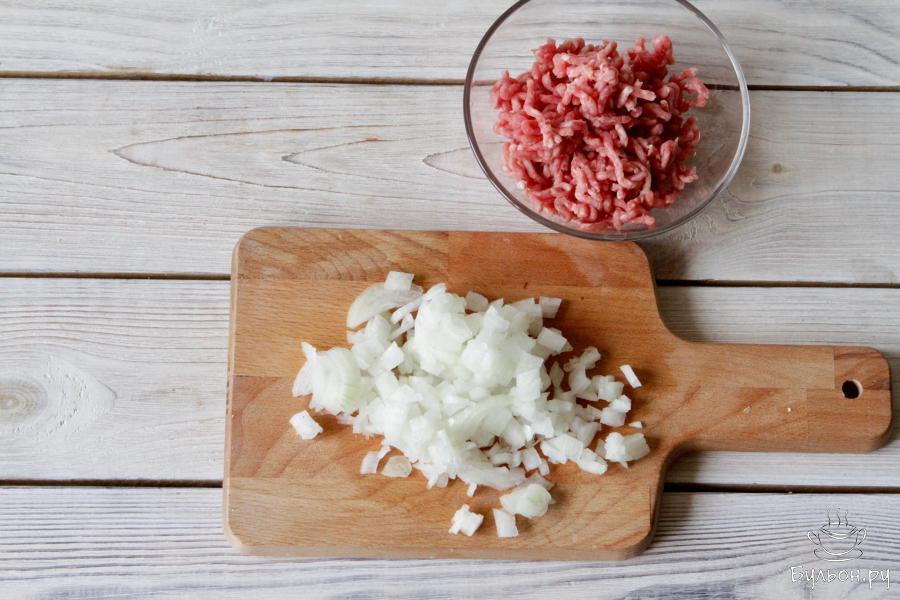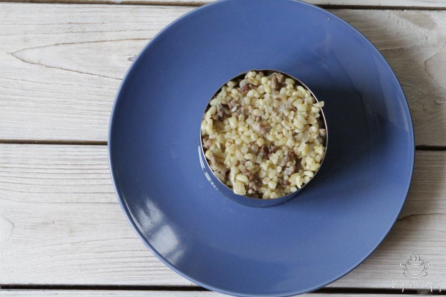 5. Влить воду и довести ее до кипения. Убавить огонь и дождаться пока выкипит вся жидкость. Добавить фарш с луком. Закрыть крышкой и оставить на медленном огне на 10-15 минут.